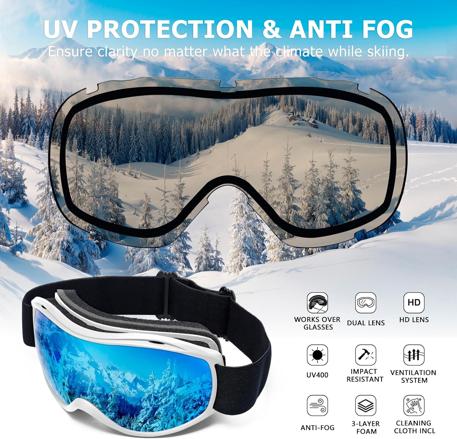 - [Clear All-day View] Our Snow goggles for men women minimize fog buildup and speed up air circulation inside the lens. Ensuring that you can wear the ski goggles over glasses for all-day skiing without worrying about fog affecting your vision.