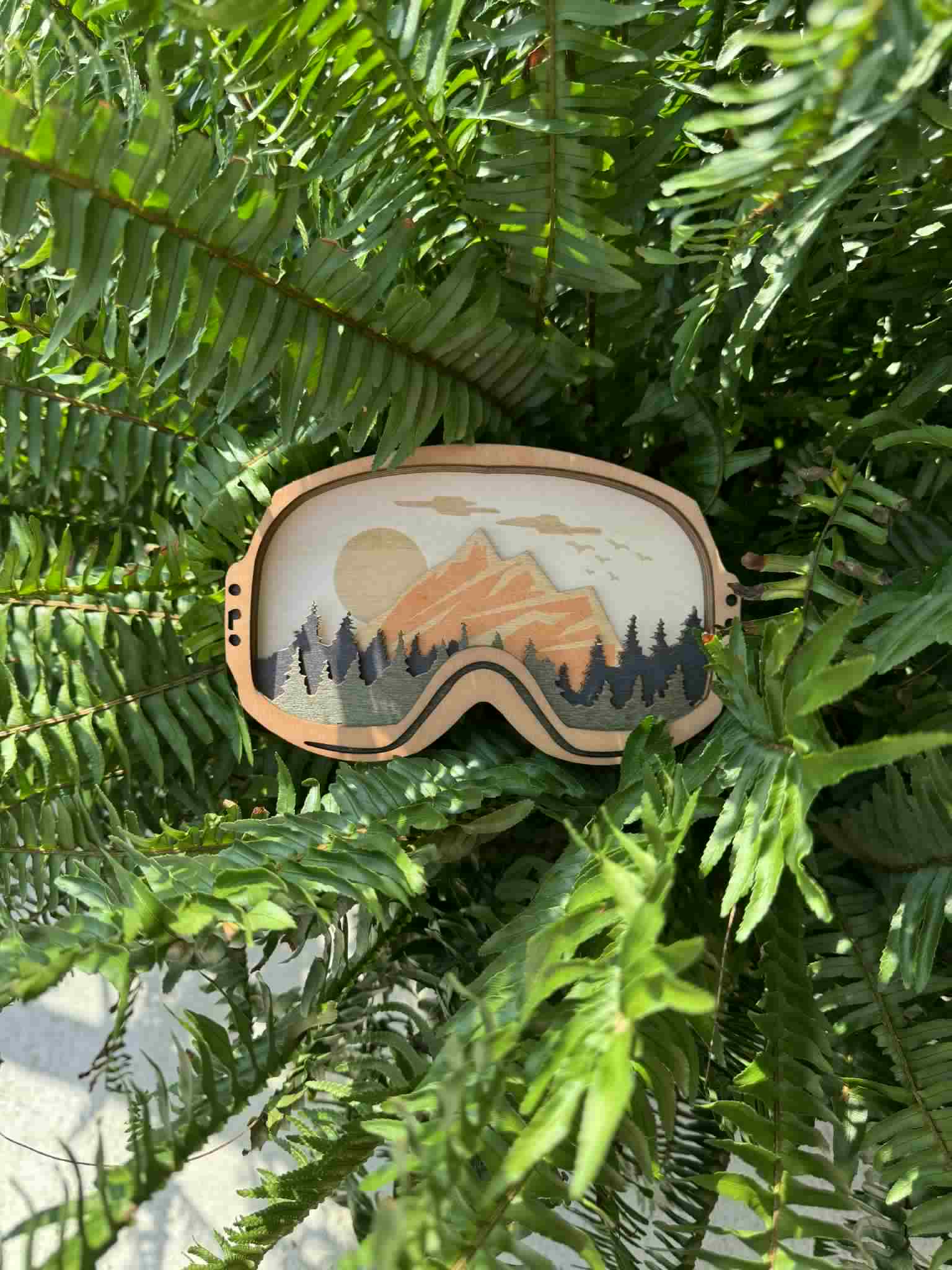 A layered wood design cut in the shape of ski goggles and featuring mountains, the sun, and pine trees.